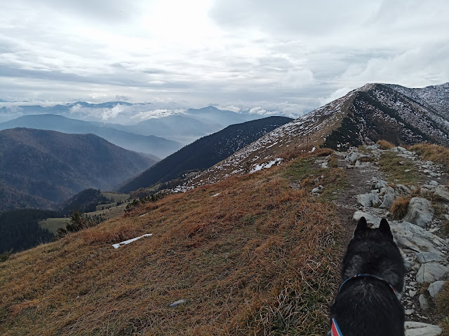 No a sme hore. Na komerčnom hrebeni Malej Fatry. Stretáme aj nejakých ľudí, ale nie je to až tak hrozné. Na chvíľku si oddýchneme a letíme sa bahniť smerom do Stohového sedla. A poviem Vám predčilo to klasický šmyk zo Stohu. Miestami sa ešte topia snehové polia a napájajú bahenné lázne čerstvou magľajúcou tekutinou. Maxíka radšej púšťam navoľno. S nim by som šiel po zadku vari až do Štefanovej. Sám išiel zopárkrát šmykom. Ja s parťáčkou sme celkom správne vyhodnotili situáciu a bez ujmy schádzame dolu. No ale blata neustáva.