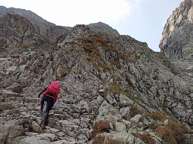 Moc sa nezdržujeme. Oddychovali sme na Posrednom Granate. Hneď začíname reťazami prudko klesať. Miestami je terén poriadne vyšmýkaný. Zdá sa mi, že skala začína meniť konzistenciu. Už to nie je ostrá a pevná žula. Skôr mi to príde ako Vápenec. Skala je viac rozmrvená a aj šmykľavejšia. Najväčia párty je na strmých severných traverzoch hrebeňa. Ten za celý deň vôbec nepreschol a blatistý povrch skál poriadne šmýka. Začína nás to poriadne oberať aj o sily. Určite o úbytok síl sa pričinilo aj teplo, batohy či samotná dĺžka túry. Klárka sa mi začína postupne vzdiaľovať. Už to nie je ako na začiatku, že v technických pasážach na reťaziach som nemal šancu. A to si vtedy Klárik ma stíhala ešte každú chvíľku fotiť.